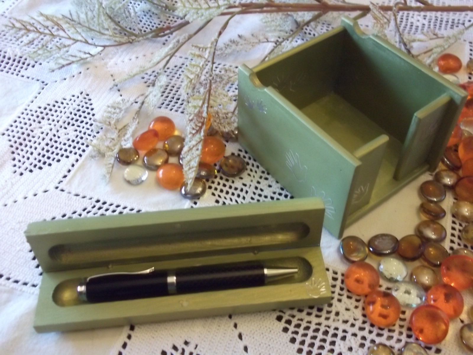 Mais um elegante conjunto formado por porta caneta/charuto e suporte de bloco notas em madeira encerada.