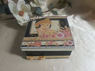 Caixa em madeira 18/13/8cm, pintada manualmente, decorada com stikers, pedrinhas brilhantes, fita de organza e aplicação em biscuit.