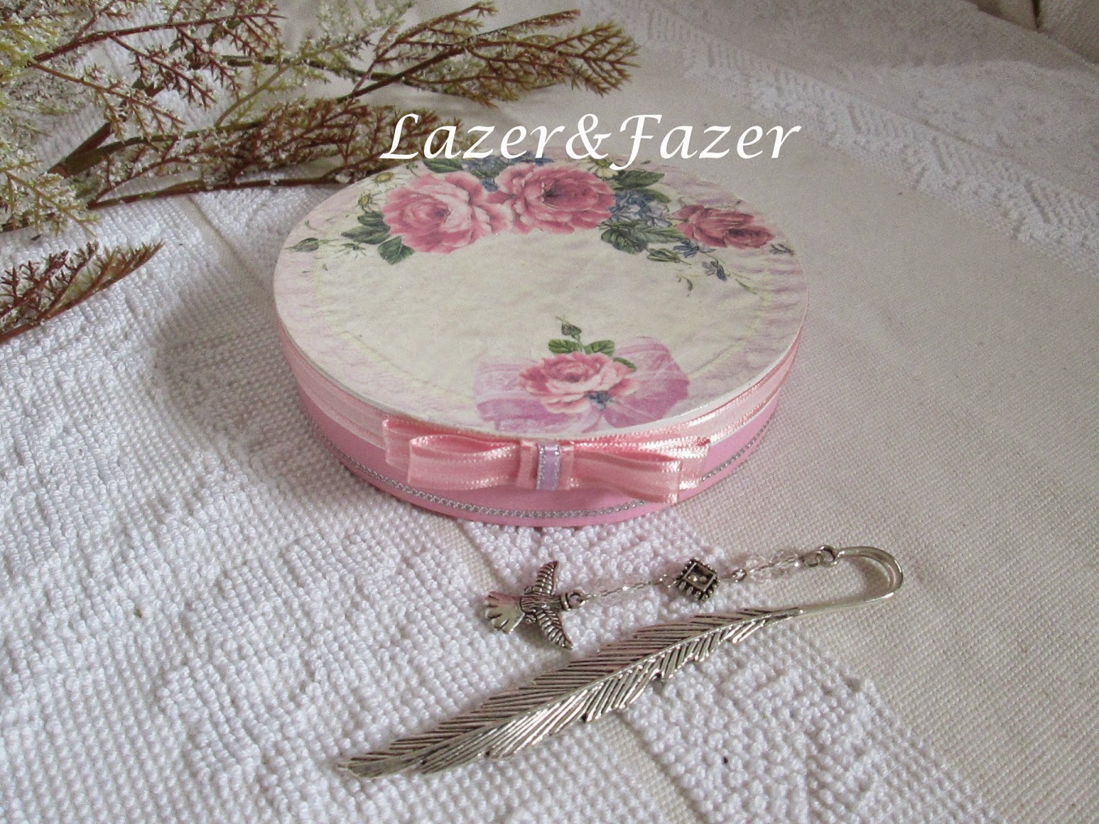 Caixas de balsa decoradas com fitas de organza/cetim e marcadores de livros em metal com aplicações