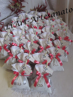 Saquinhos de linho com bordado inglês 15/10cm, com enchimento de pout-pourit, decorados com aplicações, laços de cetim nas cores escolhidas e etiqueta de agradecimento.