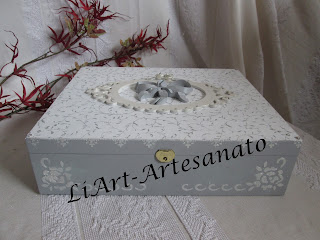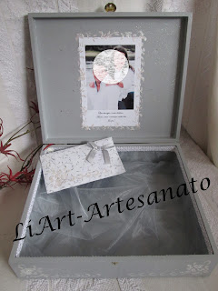 Caixa em madeira 35/30/10cm, pintada e decorada manualmente, aplicação de moldura em mdf , laço em marfinit e brilhantes, forrada com organza e desenhos com stencil e envelope com a mesma decoração.