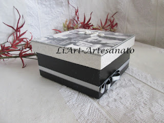 Caixa em madeira 15/15/10cm, pintada e decorada manualmente com montagem de fotografias, aplicações e fitas de cetim