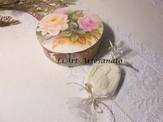 Conjuntos formados por caixa em madeira 10,5/10,5/4cm, pintadas e decoradas manualmente e dezena com flores em biscuit e perolas.
