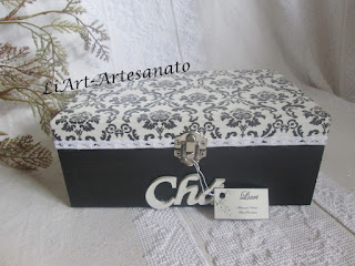 Caixa em madeira com 6 divisões para guardar saquetas de chá, pintada e decorada manualmente com rendinha.