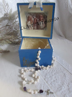 Caixa em madeira 20/20/1/15cm, pintada e decorada manualmente com aplicação de tecido e almofadado com fotografia no interior e terço em biscuit.