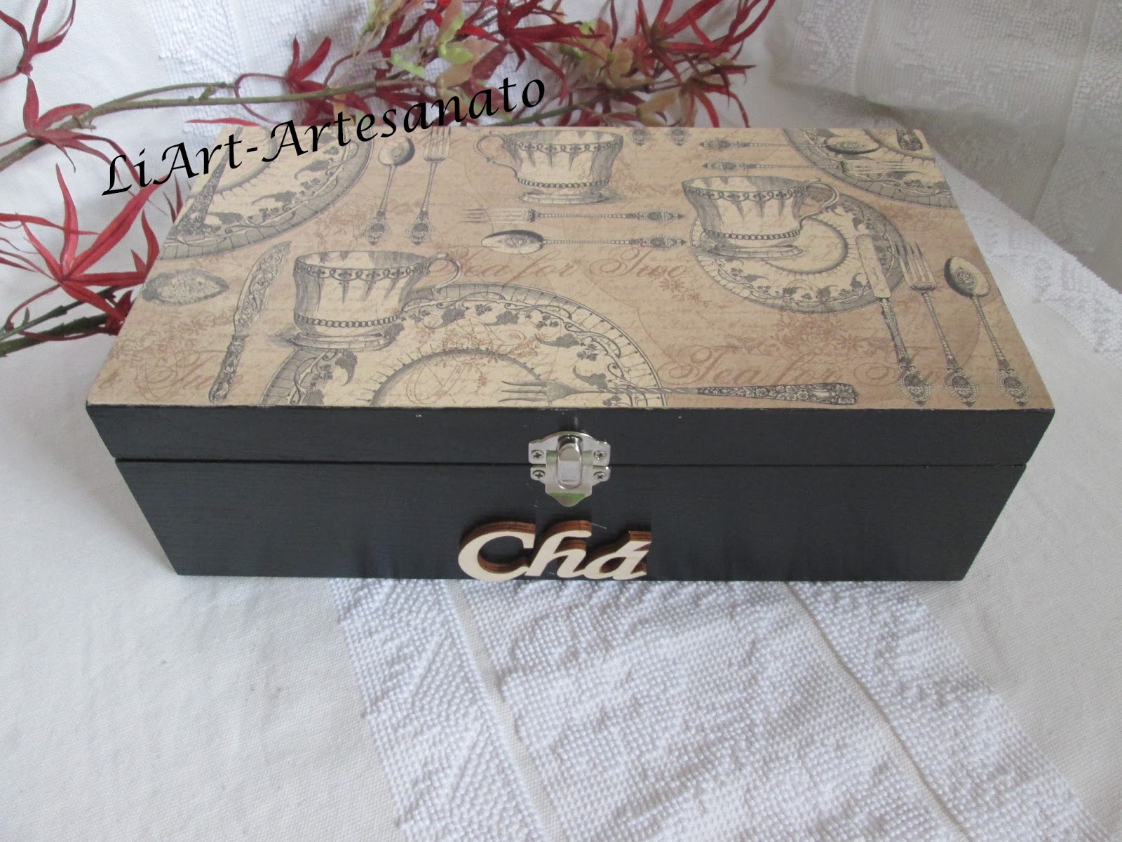 Caixa em madeira 15/15/9cm, com quatro divisões para saquetas de chá, pintada e decorada manualmente e aplicação de bordado.