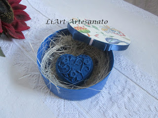Conjunto de caixa em balsa 15/7cm, pintada e decorada manualmente e sabonete artesanal com fragancia de flores brancas.