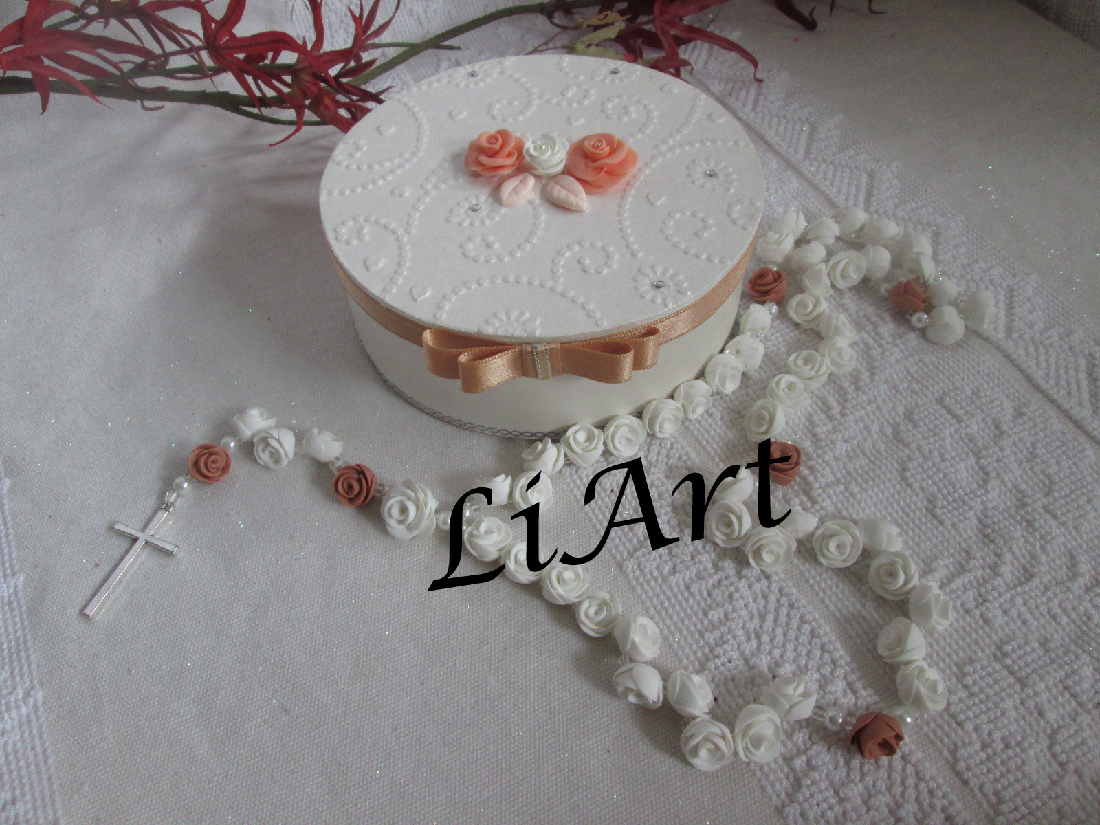 Conjunto formado por caixa em balsa 15/5cm, pintada e decorada manualmente com aplicação de flores em biscuit, brilhantes e fitas de cetim e terço todo feito á mão pétala por pétala também em biscuit.