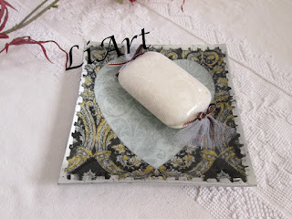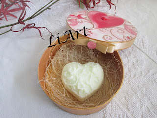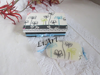 Conjunto formado por caixa em balsa 15/5cm, pintada e decorada manualmente com aplicação de meias pérolas e fitas de cetim e sabonete artesanal elaborado com glicerina enriquecida com leite de cabra e essência de pó de talco.