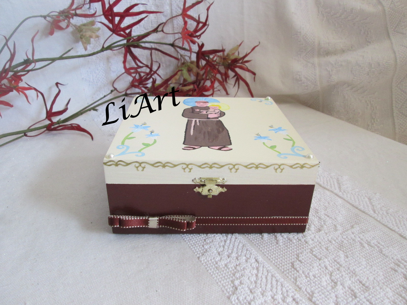 Caixa em madeira de pinho, pintada e decorada manualmente, com imagem de Santo António, aplicação de meias pérolas, flores de tecido e fitas de cetim